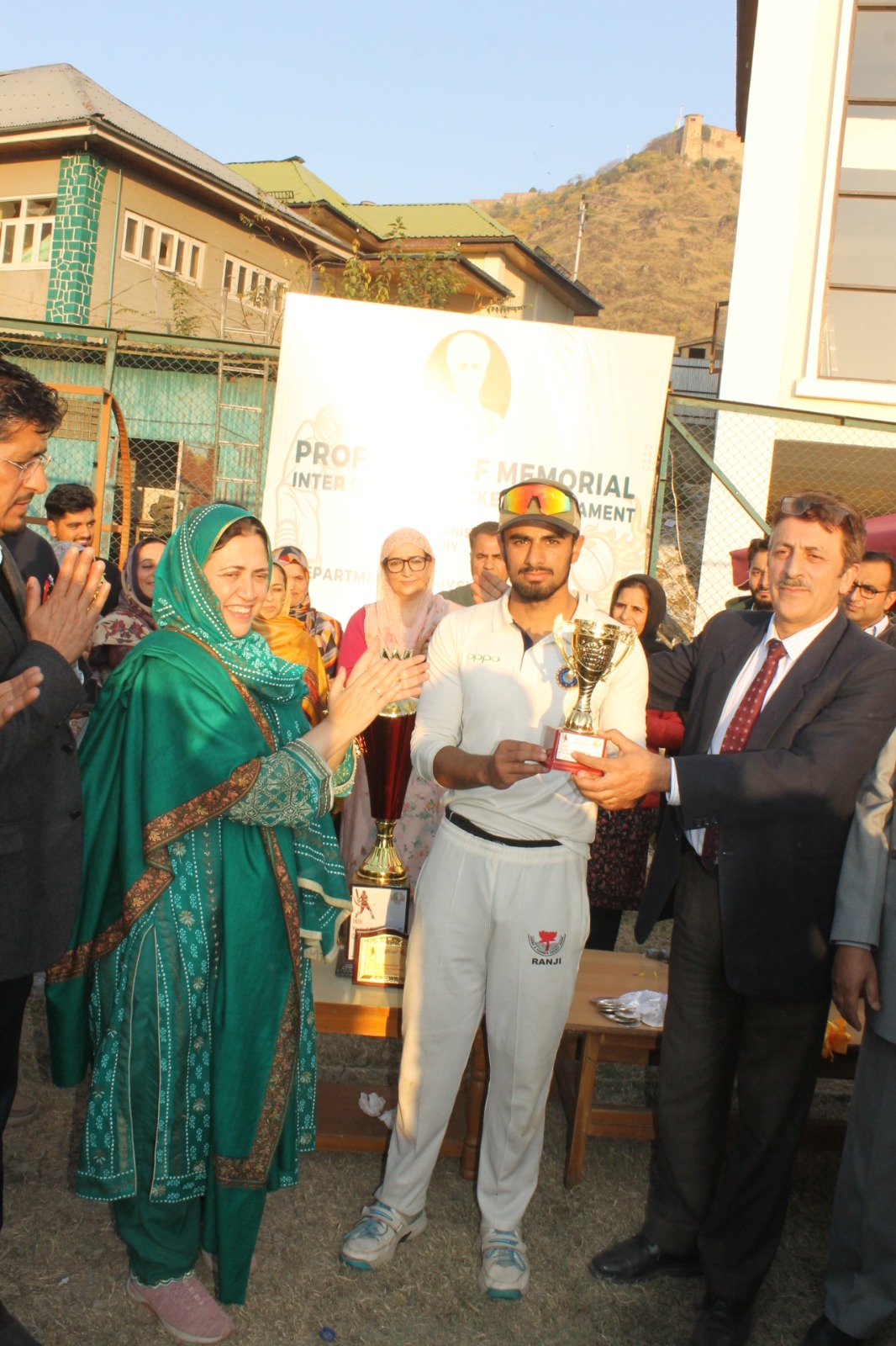 Asif Ahmad Tantray was the leading wicket-taker for GDC Sopore claiming 03 wickets. In reply, GDC Sopore was bowled out for 141 runs in 24.2 overs, falling short by just 9 runs. Asrar Ahmad, strike bowler GDC Budgam delivered a crucial bowling performance, taking 03 wickets for 16 runs in 05 overs, securing the victory for GDC Budgam. For his composed and match-winning knock of 43 runs off 42 balls, Majid Ahmad Lone, (a first-semester B.Com student) of GDC Budgam, was declared Man of the Match.The Captain and the Principal of GDC Budgam received the winner’s trophy from Prof. (Dr.) Tahmina Yousuf, Principal of the host institution, Islamia College of Science and Commerce. Prof. (Dr.) Tahmina Yousuf, along with Prof. Bashir Ahmad, Principal GDC Sopore, and Dr. Mohmad Amin Malik, Principal GDC Budgam, presented trophies, mementoes, and medals to the Man of the Match, Man of the Series, and other players of both teams. Prof. Malik lauded the team’s collective effort and extended special appreciation to Team Captain Mujtaba Hussain, Coach and Physical Training Instructor, Mr. J. S. Mehta and Convener Sports, Dr. Wahid Ahmad Dar. The nail-biting contest kept the spectators on the edge of their seats, with enthusiastic cheers for both sides reflecting the true spirit of sportsmanship.